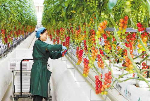 日前,在位于容城县晾马台镇的雄安智慧农业科技园内,工人正在采摘无土栽培的番茄。记者刘冰洋 摄
