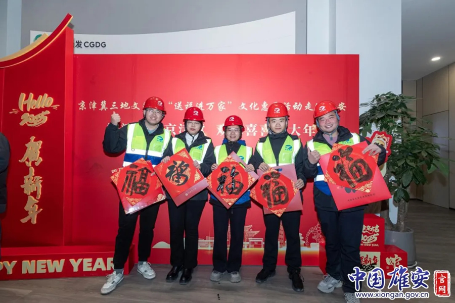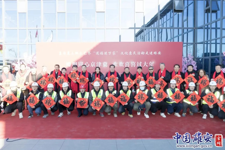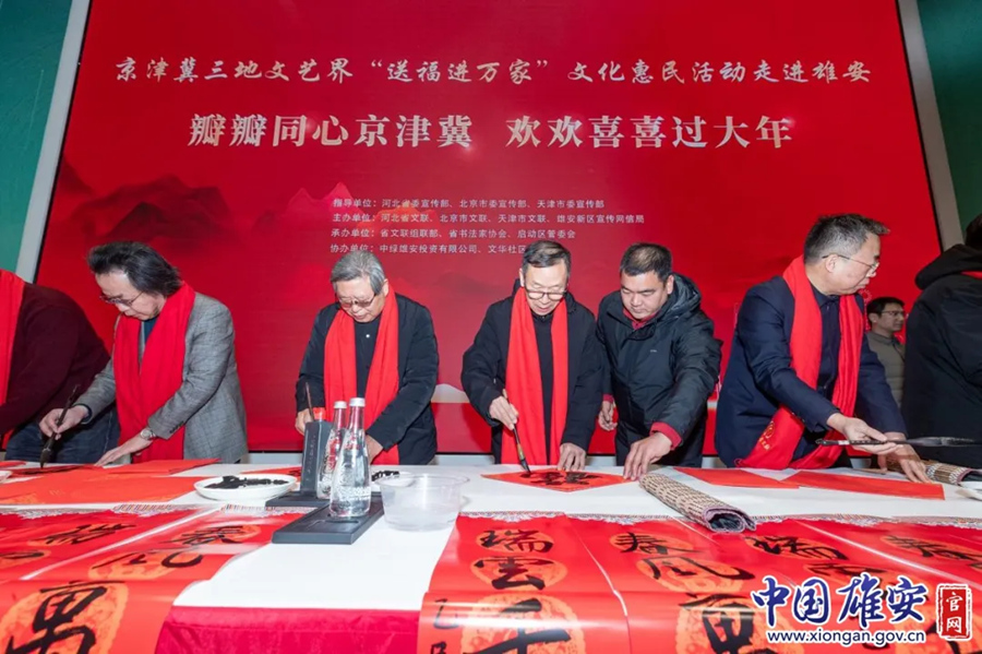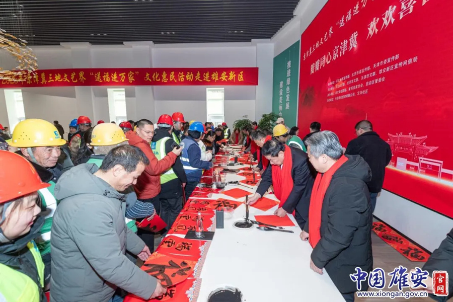 中国雄安官网1月10日电(崔利杰)1月8日,由河北省文联、北京市文联、天津市文联、雄安新区宣传网信局联合主办的京津冀文联“送福进万家”活动暨三地文艺工作者创作采风行活动走进雄安新区。来自京津冀三地的16位书法名家现场挥毫,用笔墨传递温暖与祝福,将寓意美好的福字和春联送到启动区一线的建设者和群众手中。