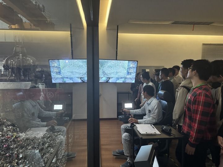 2024年10月12日,在河北雄安光大生态产业园,师生们观看工作人员操作智能垃圾吊将生活垃圾运往焚烧炉。新华社记者王美祺 摄