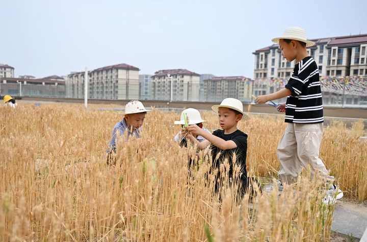 雄安容和悦容幼儿园的孩子们在“校园农场”里收获小麦(2024年5月23日摄)。新华社记者牟宇 摄