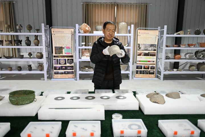 2024年3月26日,雄安新区文物保护与考古工作站负责人雷建红在整理南阳遗址出土文物。新华社记者牟宇 摄