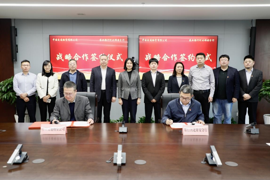 日前,中国交通物资有限公司与中国农业银行河北雄安分行签订战略合作协议,开启中国交通建设集团有限公司与中国农业银行共同落实国家重大战略合作的新篇章。未来双方将在资源共享、优势互补、协同发展等各领域全面深化合作交流,共同贯彻落实党中央、国务院关于高标准高质量建设雄安新区的决策部署,为雄安新区发展贡献力量。