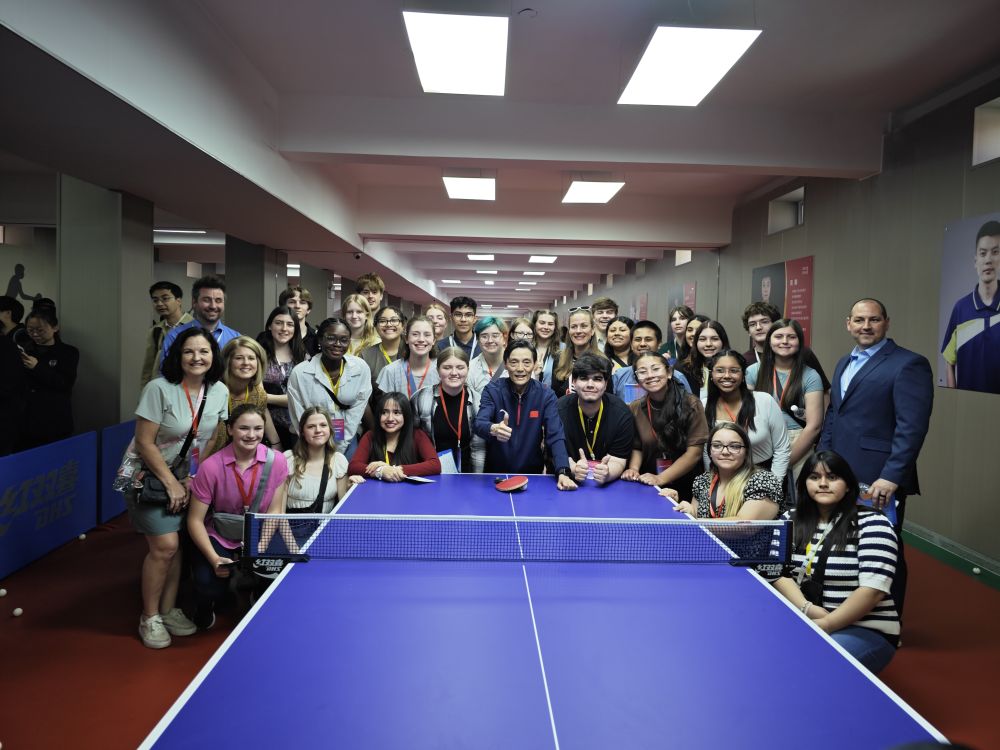美国师生在石家庄外国语学校体验打乒乓球后与中方人员合影留念。白林 摄