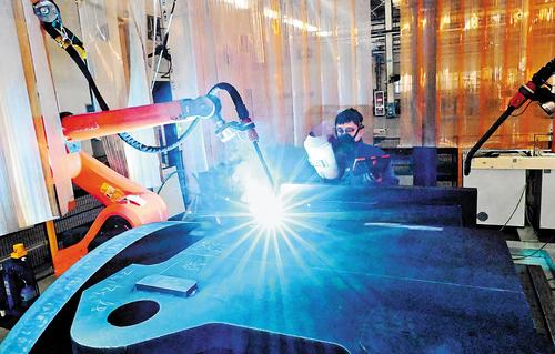1月10日,冀中能源石家庄煤矿机械有限责任公司员工操控智能焊接机器人作业。