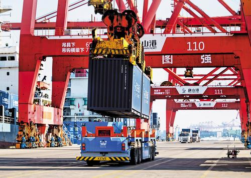 2月19日,河北港口集团京唐港区,智能平板运输车在作业。