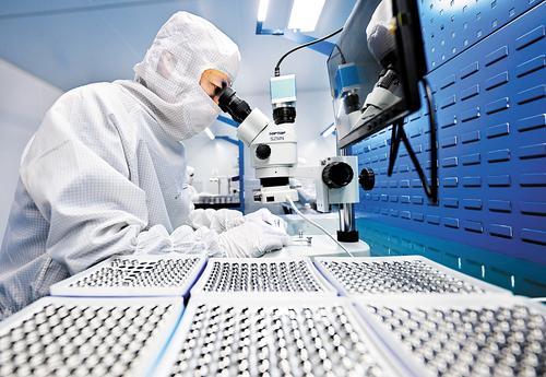 3月1日,位于文安县的河北领冠仪器仪表有限公司员工在检测半导体压力传感器配件。