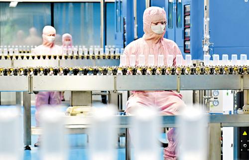 2月27日,石家庄四药集团员工在数智化生产车间作业。