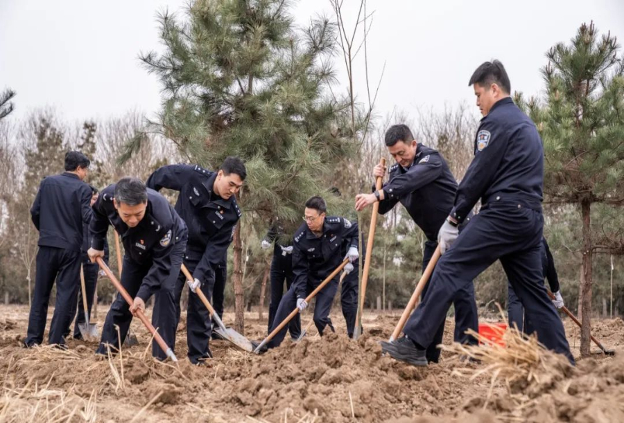 大家分工明确、相互协作,挥锹铲土、扶苗培土、浇水灌溉,每道工序都认真细致、有条不紊,形成了一道“公安蓝”与“生态绿”交相辉映的风景线,呈现出一派热火朝天的劳动景象。经过一番辛苦劳动,数十棵油松和旱柳树苗在千年秀林“安家落户”,为初春的大地增添了勃勃生机。