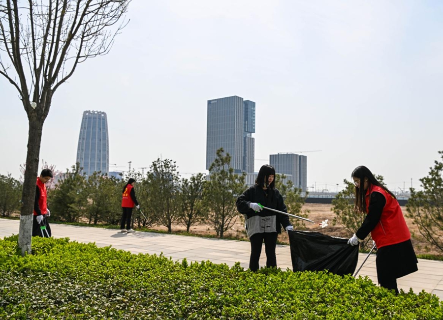志愿者在九河大街开展洁净志愿服务。启动区管委会供图