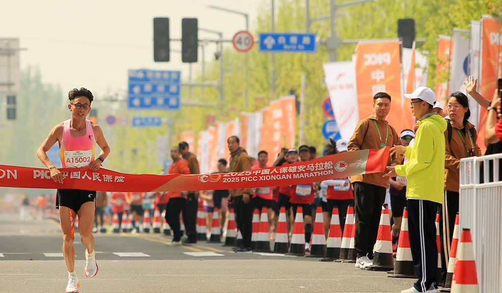 4月20日,2025雄安马拉松赛上,选手洪跃在终点闯线,以2小时18分43秒的成绩获得本届马拉松男子组冠军。河北日报客户端记者刘光昱 摄