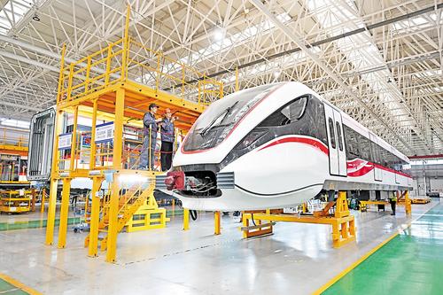 5月9日,京投装备河北京车轨道交通车辆装备有限公司,工作人员在总组装车间内工作。记者张昊 摄