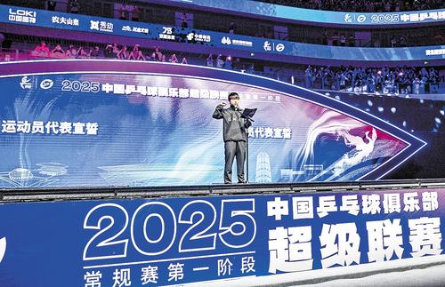 6月9日,孙颖莎代表参赛运动员宣誓。当日,2025赛季中国乒乓球俱乐部超级联赛常规赛第一阶段比赛在雄安体育中心体育馆开赛。河北日报记者耿辉 摄