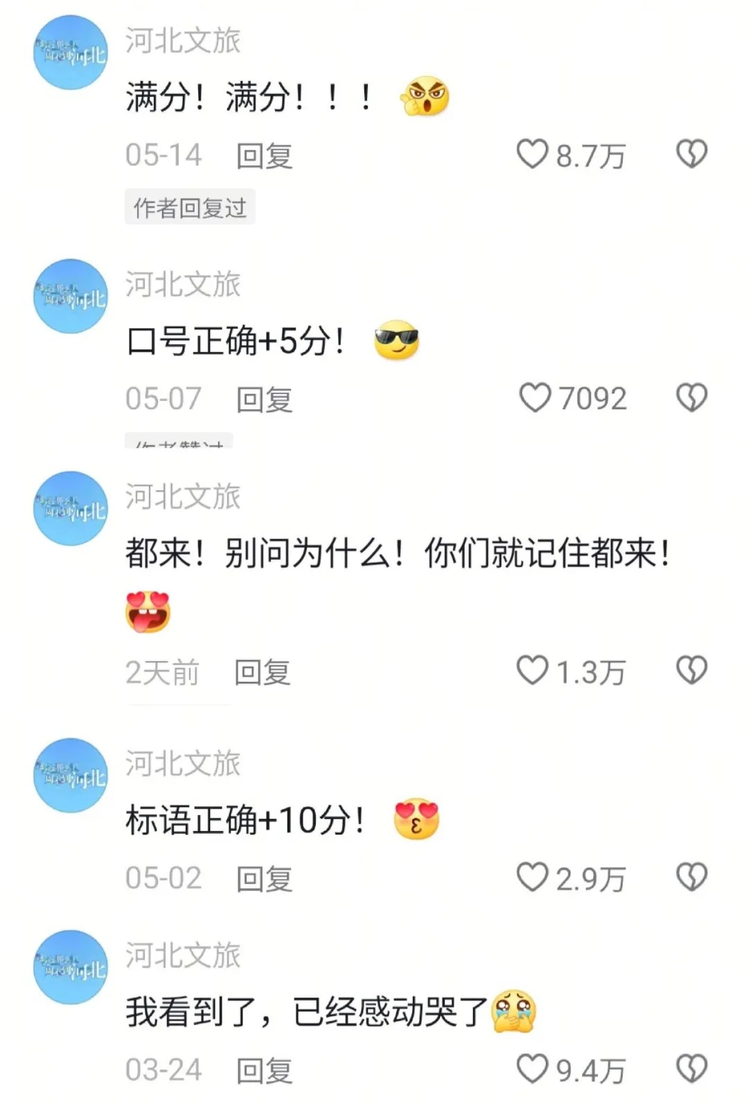 河北文旅官方账号的活跃互动更是助推了传播热度。在网友发布的世界各地打卡照片下,官方账号频频现身,用“满分!满分!!!”“标语正确+10分!”等俏皮回复与网友互动,这种“接地气”的运营方式拉近了与受众的距离,激发了更多人的参与热情。