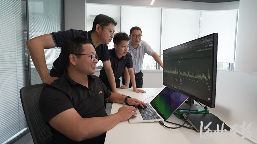8月1日,雄安人工智能产业园内,雄安华清智言科技有限公司创始人李强(左二),正跟工作人员讨论公司大模型人才实训平台完善工作。河北日报见习记者李畅 摄