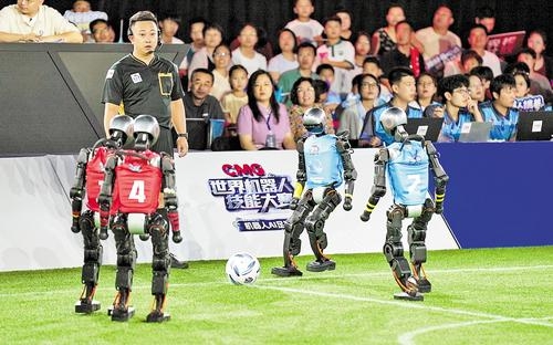 8月9日晚,雄安体育中心体育馆内,随着裁判机启动键按下,六个身高1.2米的双足机器人瞬间启动,围绕足球展开逼抢、防守、射门……这场既没教练指挥也无需遥控的比赛并非电影场景,而是“CMG世界机器人技能大赛·机器人AI足球赛”现场。
