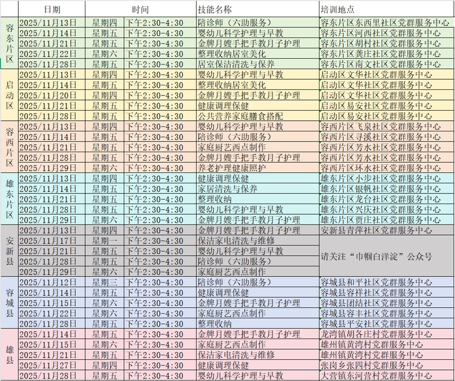11月13日至29日,雄安新区“妇联约你学家政”系列活动将在容东、容西、雄东、启动区及三县全面铺开,35场免费技能培训等你来参与!从婴幼儿护理、月子陪护、养老照护,到整理收纳、家居清洁、健康调理、陪诊服务,甚至西点制作、家庭膳食搭配——九大实用课程,面对面讲理论、手把手教实操,帮你解锁持家、就业新技能!