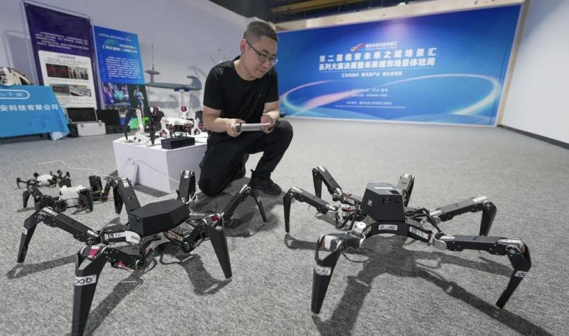 在雄安第二届场景汇与系列大赛“未来城市场景体验周”活动上,工作人员正在展示行动灵活的六足机器人。李畅 摄