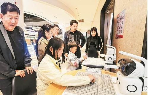 雄安商服会展中心地下商业环廊内,市民正在和机器人下五子棋。李畅 摄