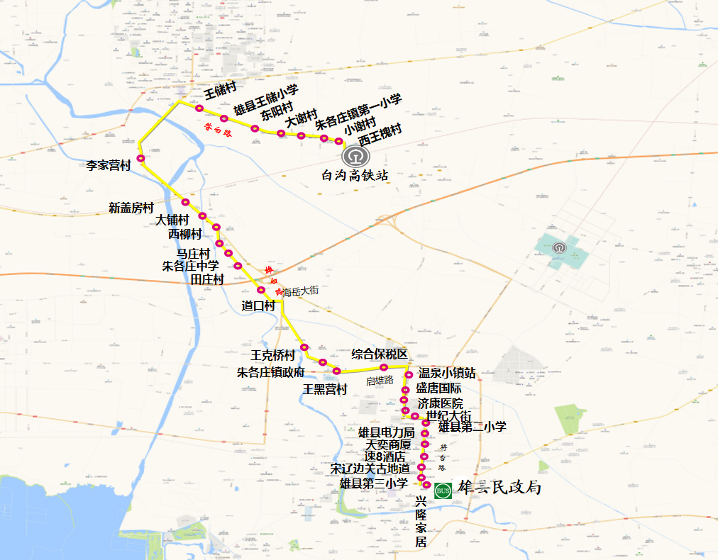 中途设站:兴隆家居、雄县第三小学、宋辽边关古地道、速8酒店、天奕商厦、雄县电力局、雄县第二小学、世纪大街、济康医院、盛唐国际、温泉小镇站、综合保税区、王黑营村、朱各庄镇政府、王克桥村、道口村、田庄村、朱各庄中学、马庄村、西柳村、大铺村、新盖房村、李家营村、王储村、雄县王储小学、东阳村、大谢村、朱各庄镇第一小学、小谢村、西王槐村。
