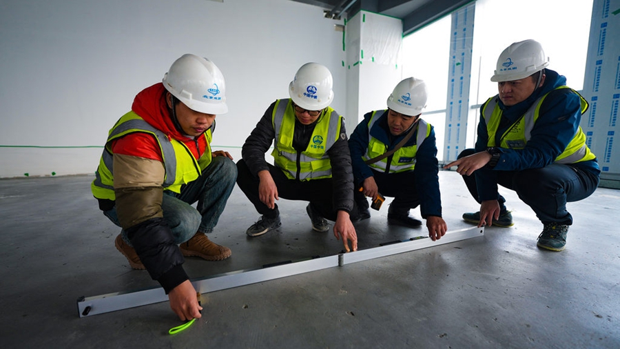 1月4日,在雄安新区启动区财富大厦项目施工现场,施工人员正在进行地面基层平整度检查。河北日报见习记者李畅 摄