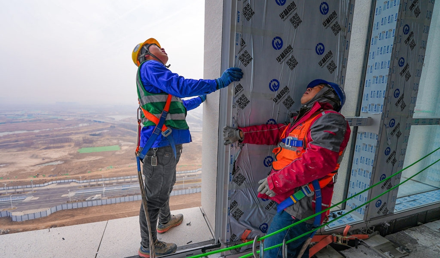 1月4日清晨,气温零下10摄氏度。在百米高的雄安新区启动区财富大厦项目(以下简称:“财富大厦”)B座19层,施工人员正进行幕墙单元体的对位与紧固作业,AB两座百米双塔的“外衣”正一片片被披挂上身。