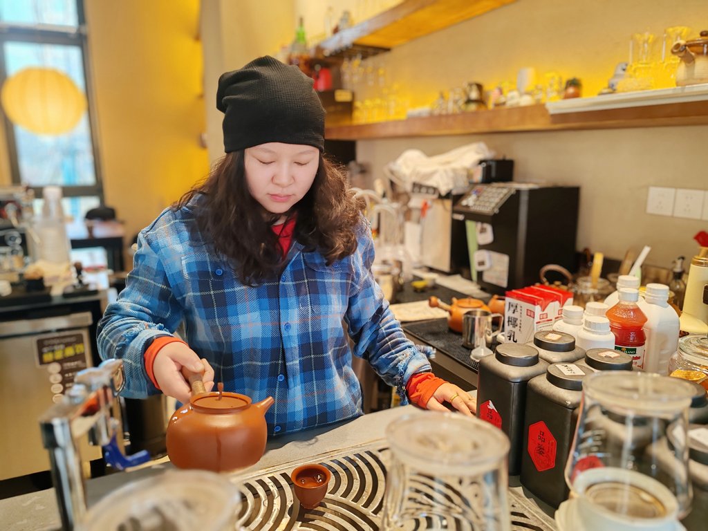 2025年12月23日,杨雷在自己创办的店铺十时安茶酒肆内忙碌。2025年8月开业以来,该店铺吸引了大量年轻人打卡。河北日报见习记者康晓博 摄