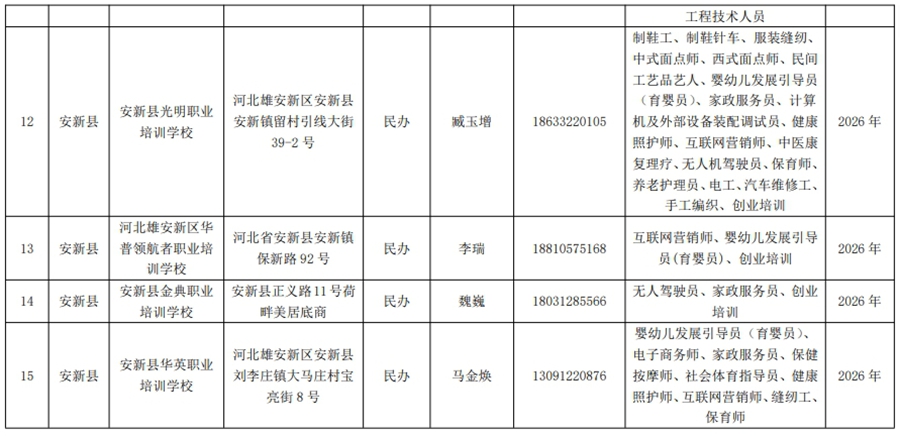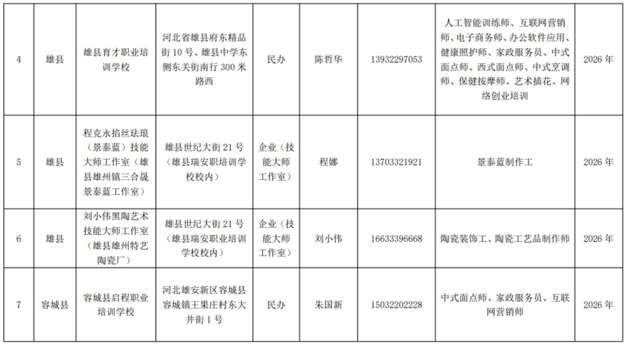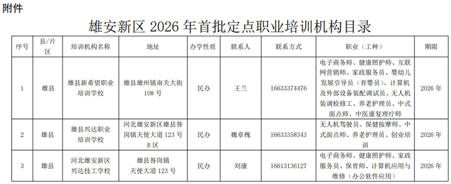 为深入实施“技能照亮前程”培训行动,推动雄安新区职业技能培训工作提质增效,促进高质量充分就业,经机构申报、评审认定、公示等程序,现将雄安新区2026年度首批定点职业培训机构目录予以公布。