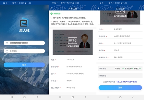 第二步:首次使用需要点击登录页面右下角“立即注册”,依次输入:姓名、身份证号、密码、手机号(两遍),并勾选《易人社手机APP用户条款》完成用户注册(已注册人员跳过第二步)。