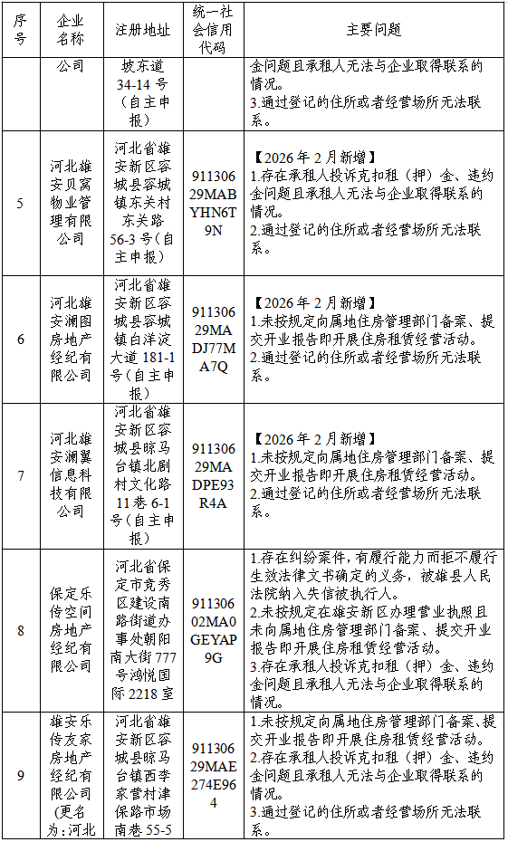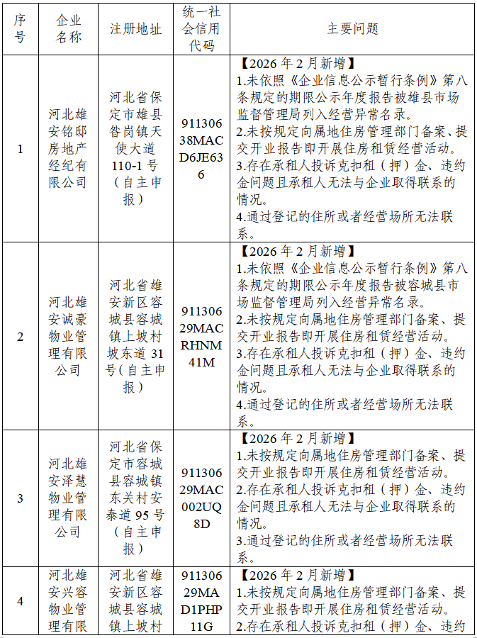 雄安新区住房租赁行业风险提示名单(2026年2月)