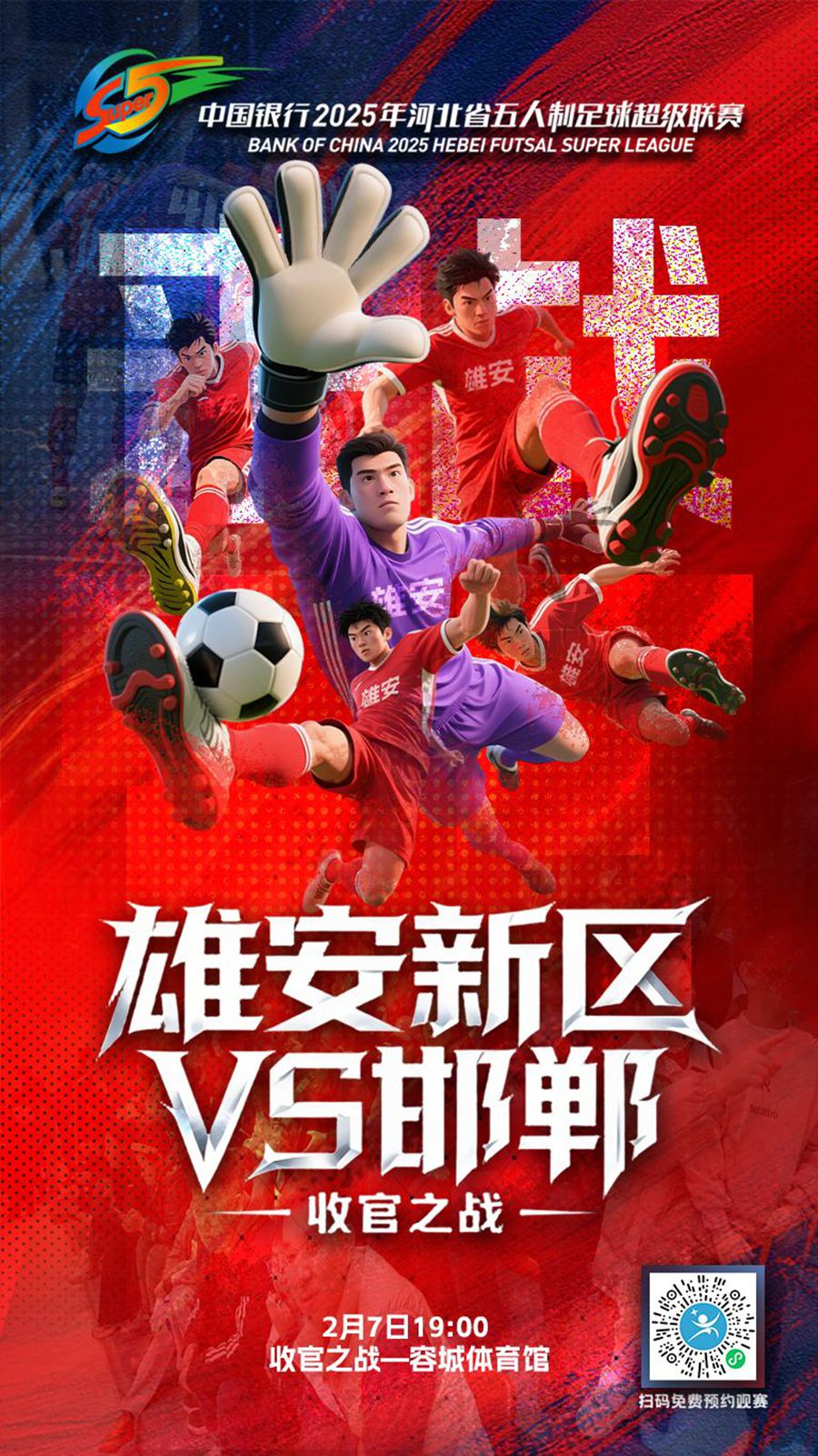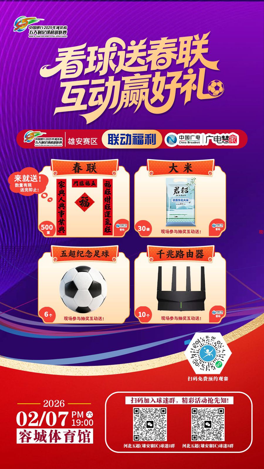 想亲临现场为雄安新区队呐喊助威,解锁新春福利?赶紧扫描下方二维码免费预约观赛,同时加入雄安赛区球迷群,第一时间获取赛事最新动态、福利预告,和志同道合的球迷一起共赴绿茵之约!