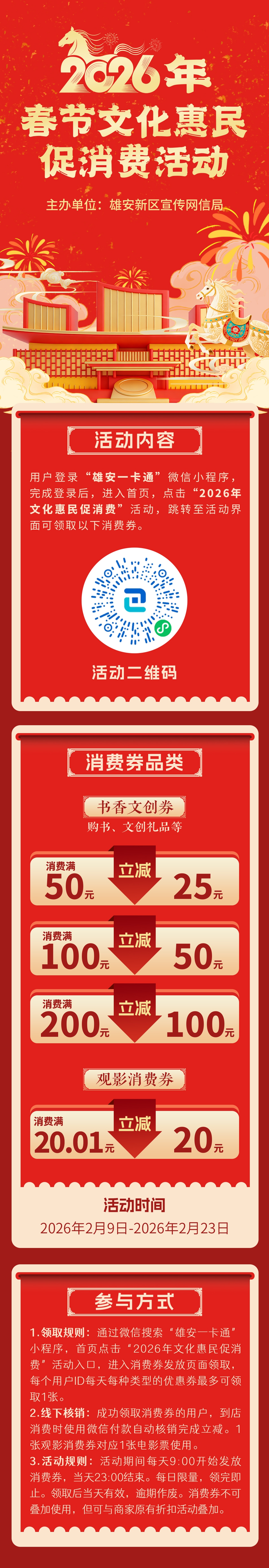 为进一步丰富雄安新区群众的精神文化生活,激发市场活力,营造欢乐祥和的节日氛围,2026年元旦以来,雄安新区安排100万元政府消费券,用于群众文化消费。2月9日上午9:00,“2026年春节文化惠民促消费”活动将准时上线。活动力度持续加大,设置满20.01元减20元、满50元减25元、满100元减50元、满200元减100元等多种消费券额度,覆盖购买图书、文创产品,观看电影等消费场景。
