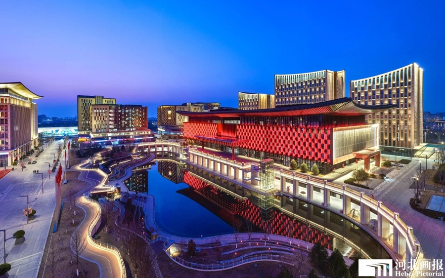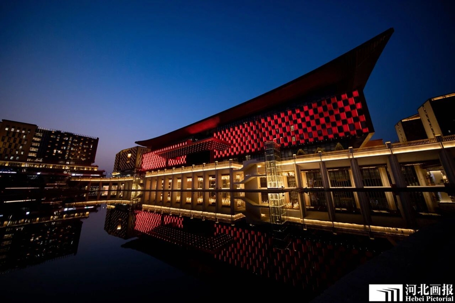 灯火勾勒出这座“未来之城”最动人的轮廓。雄安首个标志性城市建筑群——雄安商务服务中心,在夜色中尽显庄重大气。灯光顺着朱红墙体与灰色飞檐缓缓流淌,将“中西合璧、以中为主、古今交融”的建筑风骨,展现得淋漓尽致。