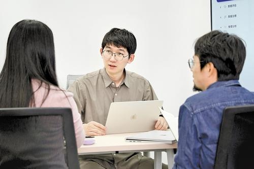 3月17日,稳准智能(雄安)科技有限公司联合创始人兼CEO张天扬与工作人员探讨“极数”数据大模型(LimiX)的优化升级方案。许志才 摄
