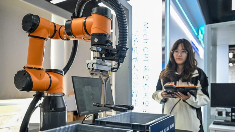 雄安新区中关村科技园内,一企业员工正在操控工业机器人。(图片来源:河北日报)