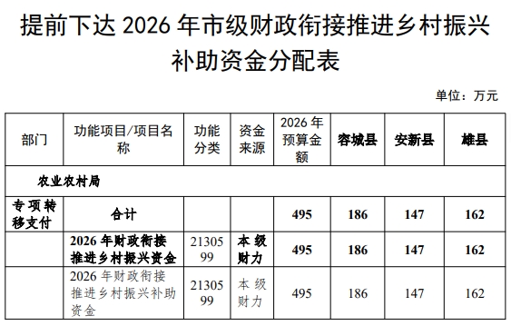河北雄安新区财政局关于提前下达2026年市级财政衔接推进乡村振兴补助资金预算的通知