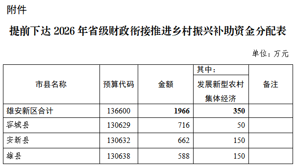 雄安新区财政局关于提前下达2026年省级财政衔接推进乡村振兴补助资金预算的通知