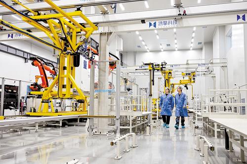 近日,蓝箭鸿擎(雄安)空间科技有限公司员工对卫星产线进行巡查。记者李东宇 摄