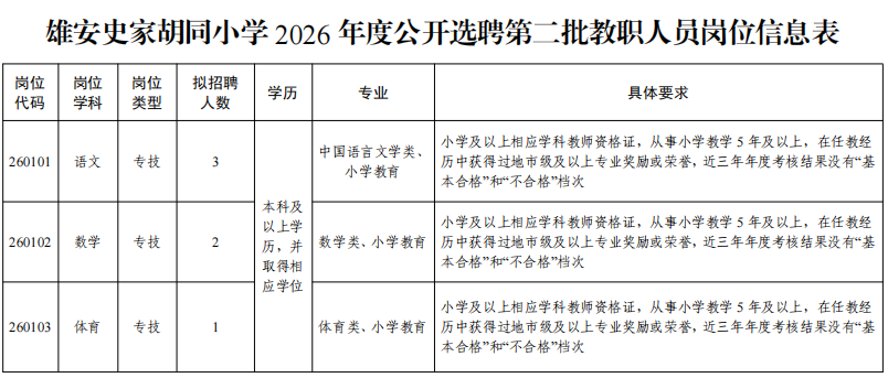 雄安史家胡同小学2026年度公开选聘第二批教职人员公告