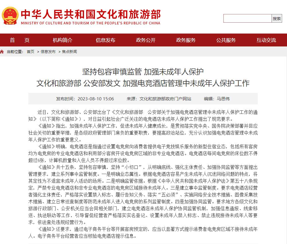 近日,文化和旅游部、公安部出台了《文化和旅游部 公安部关于加强电竞酒店管理中未成年人保护工作的通知》(以下简称《通知》),对日益引起社会广泛关注的电竞酒店未成年人保护工作提出了规范要求。