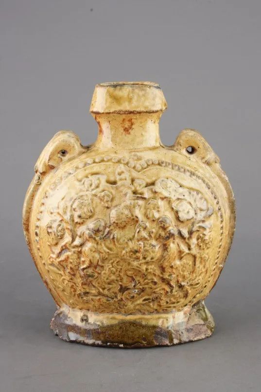 还有一件黄釉印花鸳鸯系扁壶,它宽唇扁嘴,古朴可爱,通体施的黄釉细腻光亮,从器型、图案、纹饰、工艺来欣赏,可以明显感受到外来文化对中国瓷器的影响。