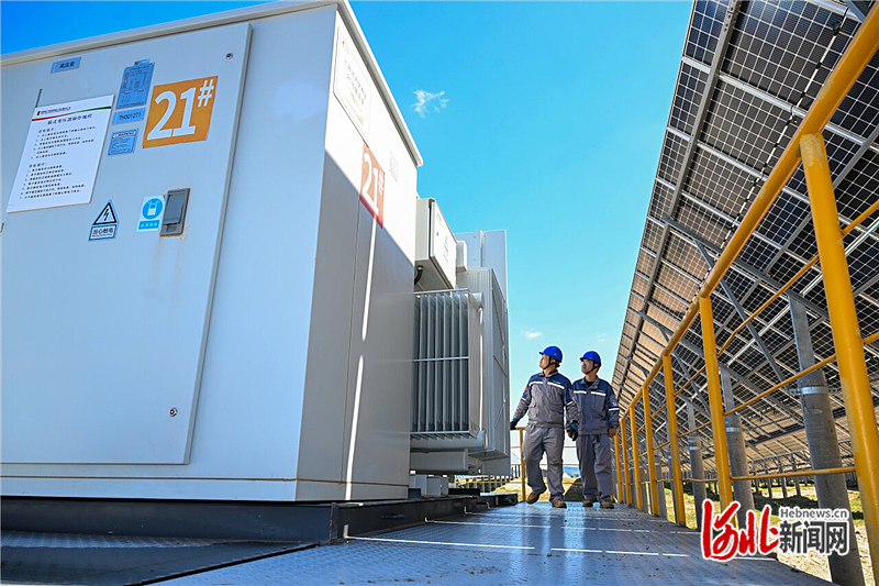 9月5日,国家电投神源围场御道口300兆瓦“七彩河”光伏电站工作人员正在巡检箱逆变一体机。河北日报记者田明 摄