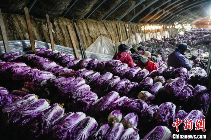 距离唐庄村不远的后独树村,王金福负责的800亩菜地里的白菜已经入窖。走进一片占地5亩多的菜窖,记者看到除了包尖白菜,摆放整齐的紫色白菜更是一眼望不到头。