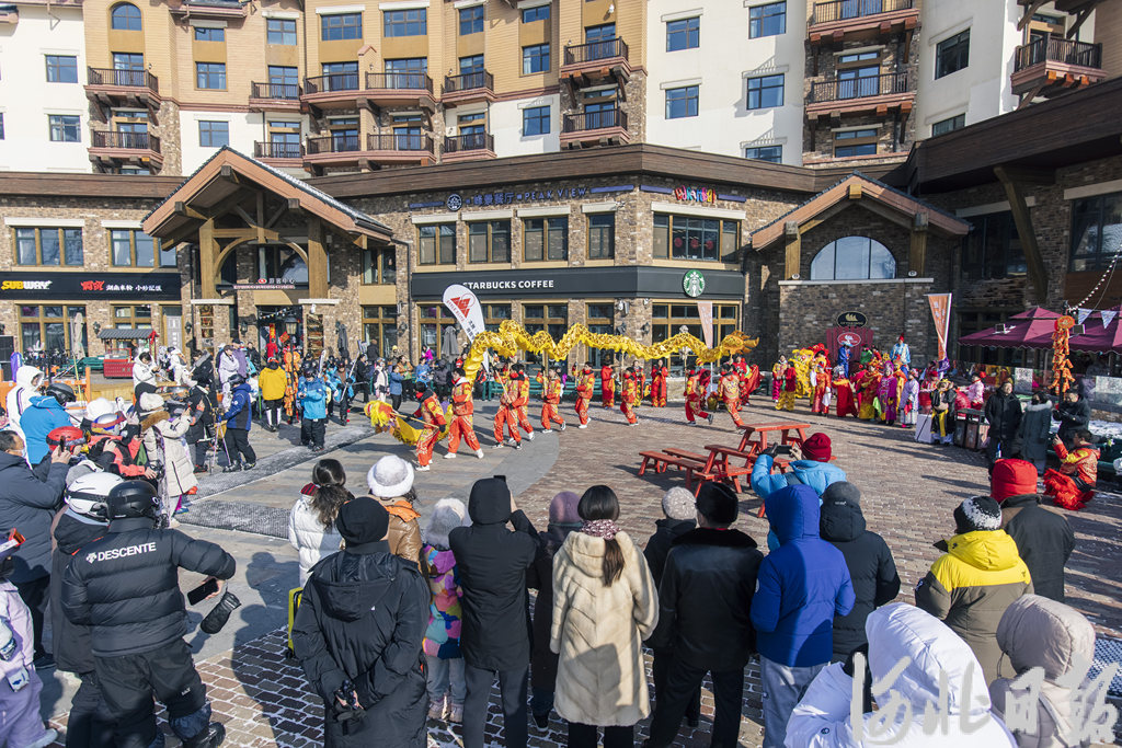 体验完滑雪后,很多游客来到户外广场,舞狮、舞龙、乐队表演,热闹非凡。春节假期,太舞小镇组织了丰富多彩的民俗表演、非遗展演活动,让游客感受到浓浓的年味儿。