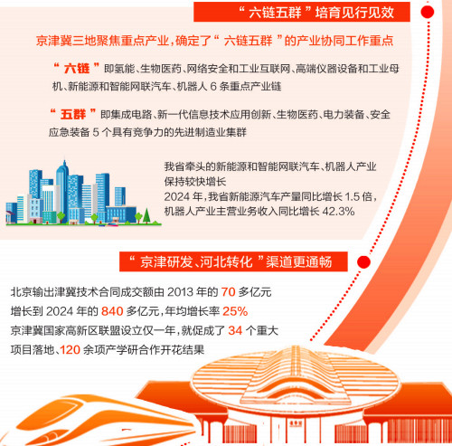 为加快京津冀6条共建产业链的联合攻关,2024年,省科技厅安排中央引导地方科技发展资金3190万元,联合京津高校院所携手开展“卡点”技术攻关17项。同时,三地还共同投入3000万元实施京津冀基础研究专项,围绕新能源和智能网联汽车、机器人两条链开展基础科学问题研究。