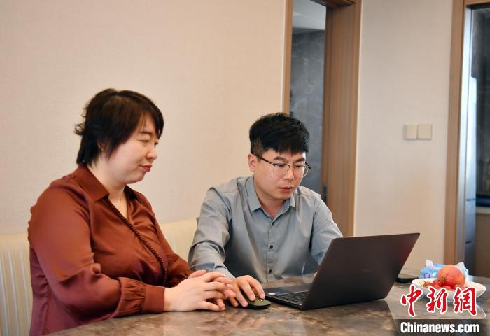 3月22日,正在家中办公的许蒙超和妻子赵肖依。中新社记者韩冰 摄