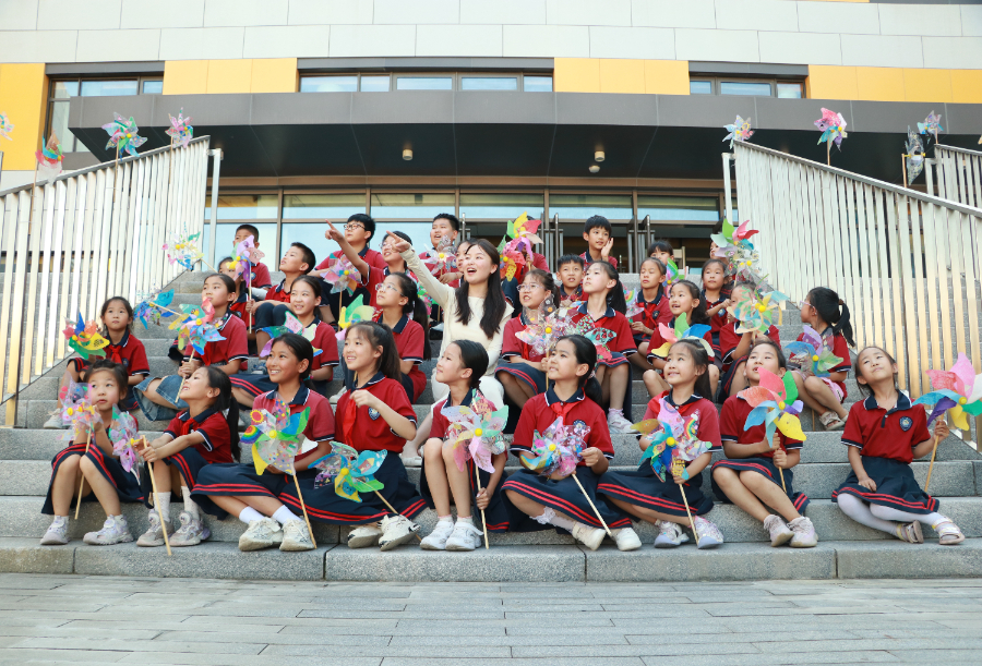 在容东片区金源小学教学楼前,陈思(中)与孩子们共同表演节目。