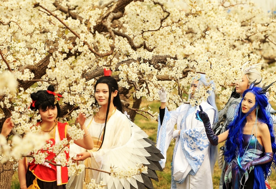 4月8日,第四届雄安·雄州文化艺术节多项活动在雄安新区雄县梨水湾生态园举办。图为哪吒天团COS畅游万亩梨花海。河北日报客户端记者刘光昱 摄