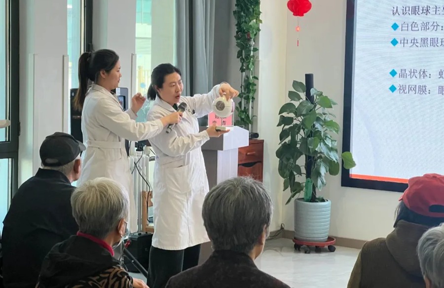 针对春季疾病高发特点,专家通过互动问答形式科普流感、过敏等预防要点,强调勤洗手、多通风的重要性。专家现场还借助眼球仪模型演示白内障病变过程,向大家详细介绍了白内障的形成原因、症状表现、治疗方法等相关知识,直观呈现“早筛查、早干预”的必要性。
