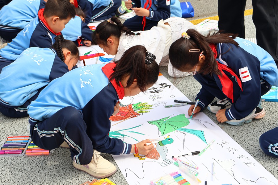 安新县雁翎小学以“童心绘国安 长卷载山河”为主题,开展十米长卷集体创作活动。雄安新区教育局供图