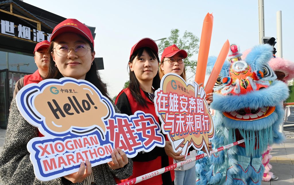 4月20日,2025雄安马拉松开赛。启动区赛道边上,“中绿里”志愿者们为选手加油。河北日报客户端记者刘光昱 摄